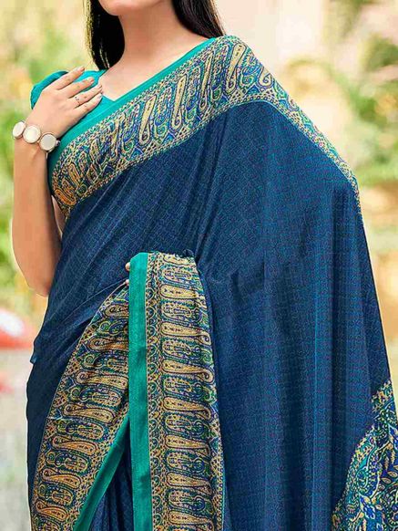Stylish Blue Crepe Saree with Floral Paisley Geometric Patterns Unstitched Blouse